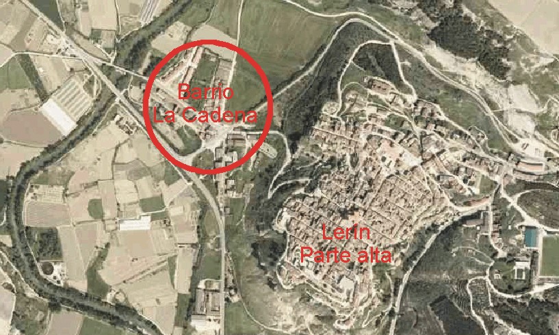 Fotografía aérea de la localidad de Lerín, donde se señala la posición del Barrio de La Cadena.