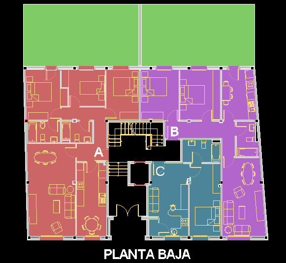 La planta baja comprende tres viviendas. La vivienda A (color rojo en el plano de la planta) tiene salón, cocina, tres dormitorios y dos baños, que totalizan 89,94 metros cuadrados útiles (prácticamente el máximo permitido para viviendas de protección oficial, que es de 90 metros cuadrados). Dispone también de un espacio privado en la parte posterior del edificio (representado en color verde). Además, tiene anexo un trastero en la planta sótano del edificio, de 14,45 metros cuadrados. La vivienda B (color morado en el plano de la planta) tiene salón, cocina, dos dormitorios y un baño, que totalizan 69,52 metros cuadrados útiles. Dispone también de un espacio privado en la parte posterior del edificio (representado en color verde). Además, tiene anexo un trastero en la planta sótano del edificio, de 14,99 metros cuadrados. La vivienda C (color azul verdoso en el plano de la planta) tiene salón-cocina (en un mismo espacio), un dormitorio y un baño, que totalizan 36,35 metros cuadrados útiles. Además, tiene anexo un trastero en la planta sótano del edificio, de 14,99 metros cuadrados. |