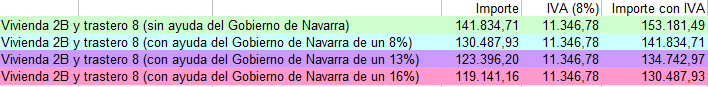 Los precios de las viviendas de protección oficial tienen un límite máximo que viene reflejado en los precios máximos y subvenciones del Gobierno de Navarra para VPO de régimen general del año 2011. La forma de calcular dicho precio máximo consiste en multiplicar la superficie útil de las viviendas por el precio máximo por metro cuadrado permitido por el Gobierno de Navarra; de existir anexos (garajes o trasteros), hay que añadir el coste de los mismos (precio máximo por metro cuadrado de anexo multiplicado por la superficie útil de los mismos). Del importe obtenido tras multiplicar las superficies de vivienda y trastero por sus respectivos precios, habría que descontar las subvenciones; rogamos se vean los precios máximos y subvenciones del Gobierno de Navarra para VPO de régimen general del año 2011, y se determine a qué porcentaje de subvención se tendría derecho. Este porcentaje será mayor para el caso de familias numerosas con ingresos bajos, y menor conforme suban los ingresos y baje el número de miembros de la familia. Observe también que hay cierto nivel de ingresos para el que se permite comprar la V.P.O. pero no se da ninguna subvención (sin embargo, las limitaciones de una V.P.O., como por ejemplo el no poder venderla libremente, si que están presentes). A continuación se muestra el precio de la vivienda 2B, junto con el trastero 8, para los distintos casos de subvenciones del Gobierno de Navarra. Caso de tener alguna duda o desear que le calculemos la subvención, no dude en ponerse en contacto con nosotros. |
